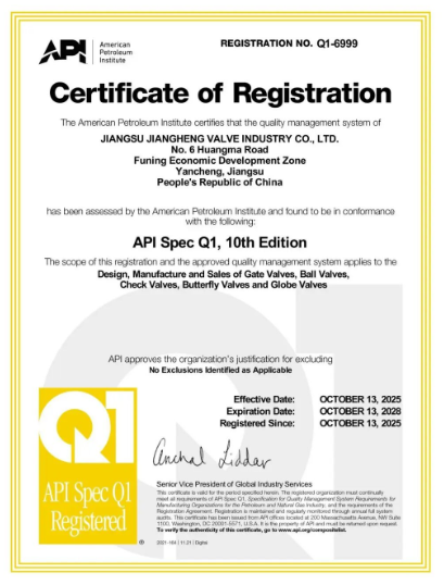 自2007年首次获得API证书以来,江恒阀业持续深耕行业标准建设,今年再次成功取得API6A、APIQ1两项重要认证证书,同时顺利完成了API6D、API600、API602、API609的换证复审工作。