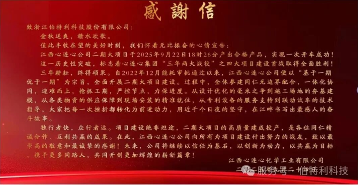 近日,浙江伯特利科技股份有限公司收到江西心连心化学工业有限公司(以下简称"心连心")发来的感谢信。信中,心连心对伯特利在二期大项目中提供的关键阀门产品表示高度认可,并特别感谢伯特利团队在技术攻关、物资保障及现场协同中的卓越贡献。