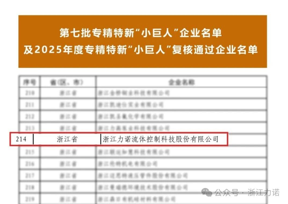 近日,浙江力诺流体控制科技股份有限公司(以下简称「浙江力诺」)接连收获两项重要资质复核成果,彰显企业在专业化发展与商业信誉方面的持续实力。根据工业和信息化部公布的浙江省第七批及复核通过企业名单,浙江力诺凭借在工业控制阀领域的深厚积累与持续创新能力,顺利通过2025年度国家级专精特新「小巨人」企业复核。