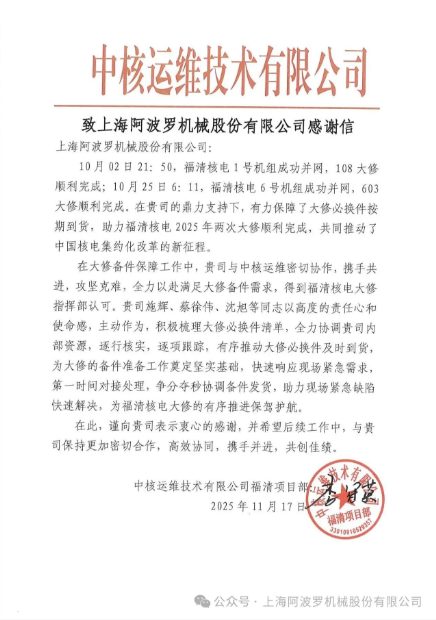 该感谢信是肯定、是鼓舞、更是动力。未来,阿波罗将再接再厉,以高度的责任心和使命感,为保障国家重点工程的安全稳定运行贡献力量,携手合作伙伴,共同续写核能事业安全高效发展的新篇章。