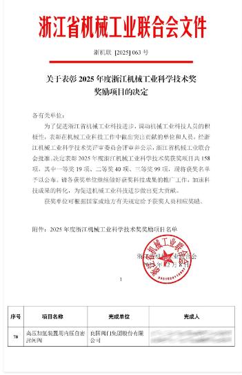 良固阀门集团荣获2025年度浙江机械工业科学技术奖三等奖
