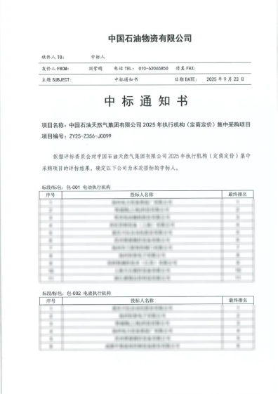 近日,中国石油天然气集团有限公司2025年集中采购项目评标结果正式揭晓,特技阀门集团凭借深厚的技术积累、卓越的产品品质与完善的服务体系,成功突围,一举入围气动薄膜笼式套筒调节阀、高压气动薄膜直通单座调节阀、气动快速切断蝶阀、高压气动 O 型切断球阀等12个核心标段。