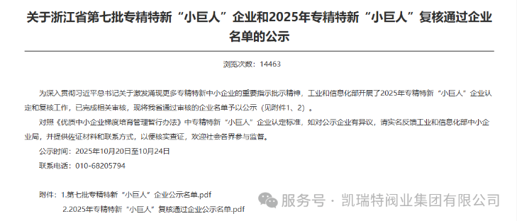 近日,工业和信息化部正式公示第七批专精特新“小巨人”企业名单。凯瑞特阀业集团有限公司(以下简称凯瑞特阀业)凭借在高端阀门领域的技术积淀与创新突破,成功入选这一国家级企业荣誉殿堂,成为瑞安市高端装备制造的又一张“金名片”。