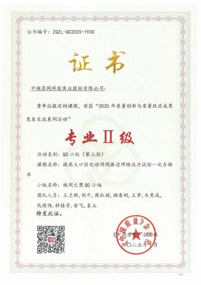 近日,由《中国质量》杂志社主办的2025年中国质量创新与质量改进成果发表交流系列活动(QC小组第三期)在武汉圆满落幕。中核苏阀科技实业股份有限公司(以下简称“中核科技”)“核阀之鹰”QC小组凭借《提升大口径电动闸阀唇边焊缝压力试验一次合格率》课题成果脱颖而出,荣获专业Ⅱ级重要奖项。此举不仅斩获新荣誉,更延续了公司在质量管理创新领域连续三年荣获全国级别奖项的亮眼纪录。