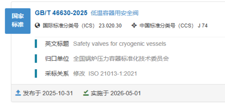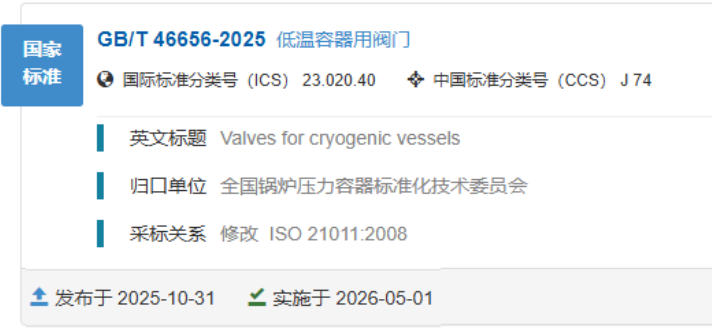 雷舸流体科技(上海)有限公司作为ISO/TC 220(国际低温容器技术委员会)WG3工作组中国的组长单位,一直致力于国内外低温阀门产品标准的起草和制定。由我司牵头起草的两项国家标准GB/T46630-2025《低温容器用安全阀》和GB/T46656-2025《低温容器用阀门》,在2025年10月31日正式发布,并将于2026年05月1日开始施行。
