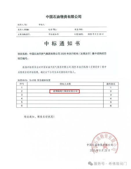 在全体同仁齐心协力、奋勇拼搏之下,希佛隆阀门集团有限公司迎来了令人瞩目的高光时刻。此次,公司以第二名的优异成绩中标中国石油天然气集团有限公司2025年执行机构(电动(液)执行机构、控制阀、紧急截断装置)集中采购项目(定商定价) - 包15紧急截断装置项目。这一成绩的取得绝非偶然,它是希佛隆阀门长期以来坚持技术创新、注重产品质量的有力证明。在众多竞争对手中脱颖而出,充分展现了公司在阀门领域的深厚底蕴和强大竞争力。